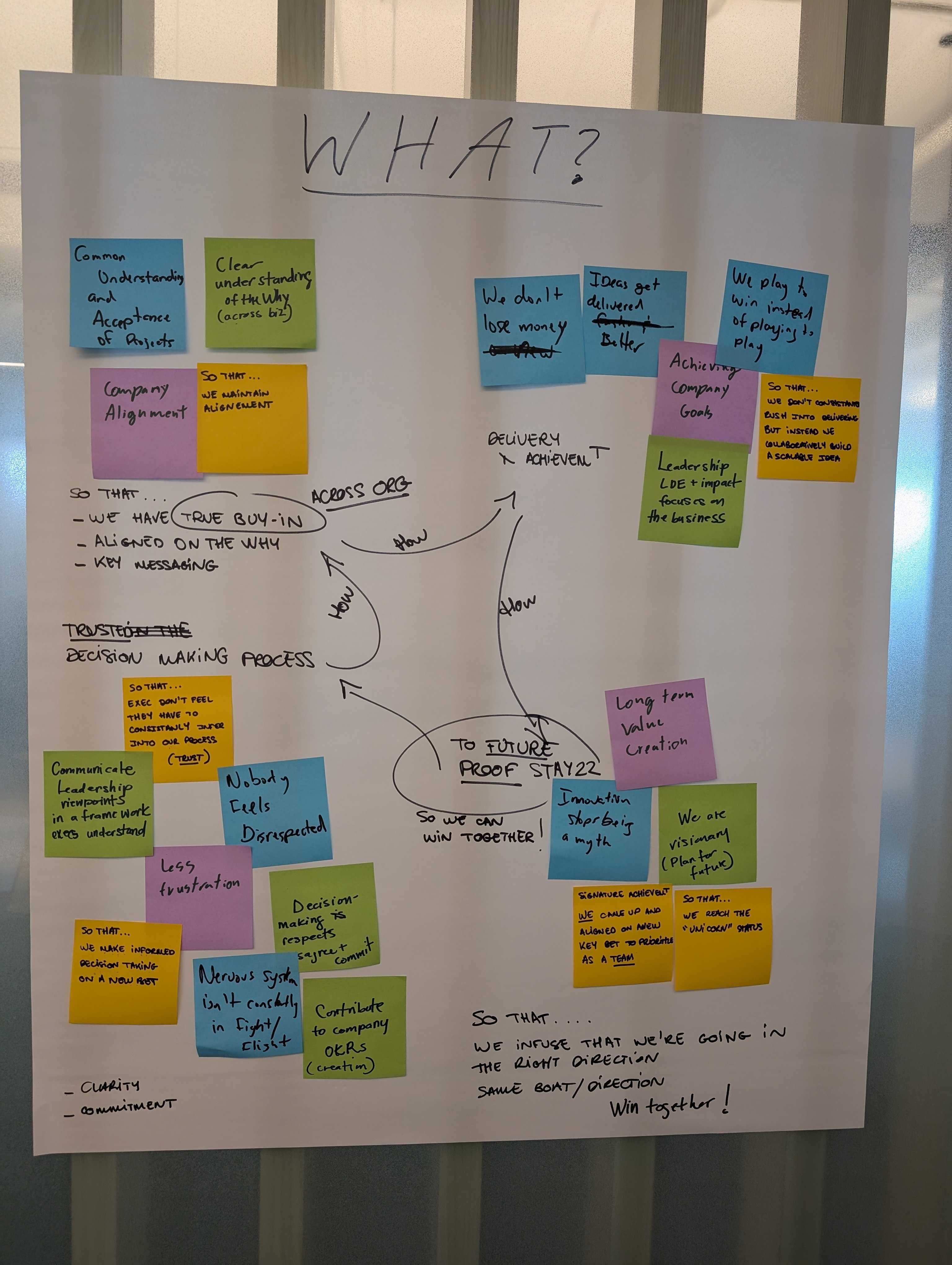 Vague, individual frustrations were coalescing into clear, shared principles. Looking at the vibrant constellations of yellow, blue and orange notes on the “WHY?” posters, I saw the anatomy of our team’s purpose emerge.