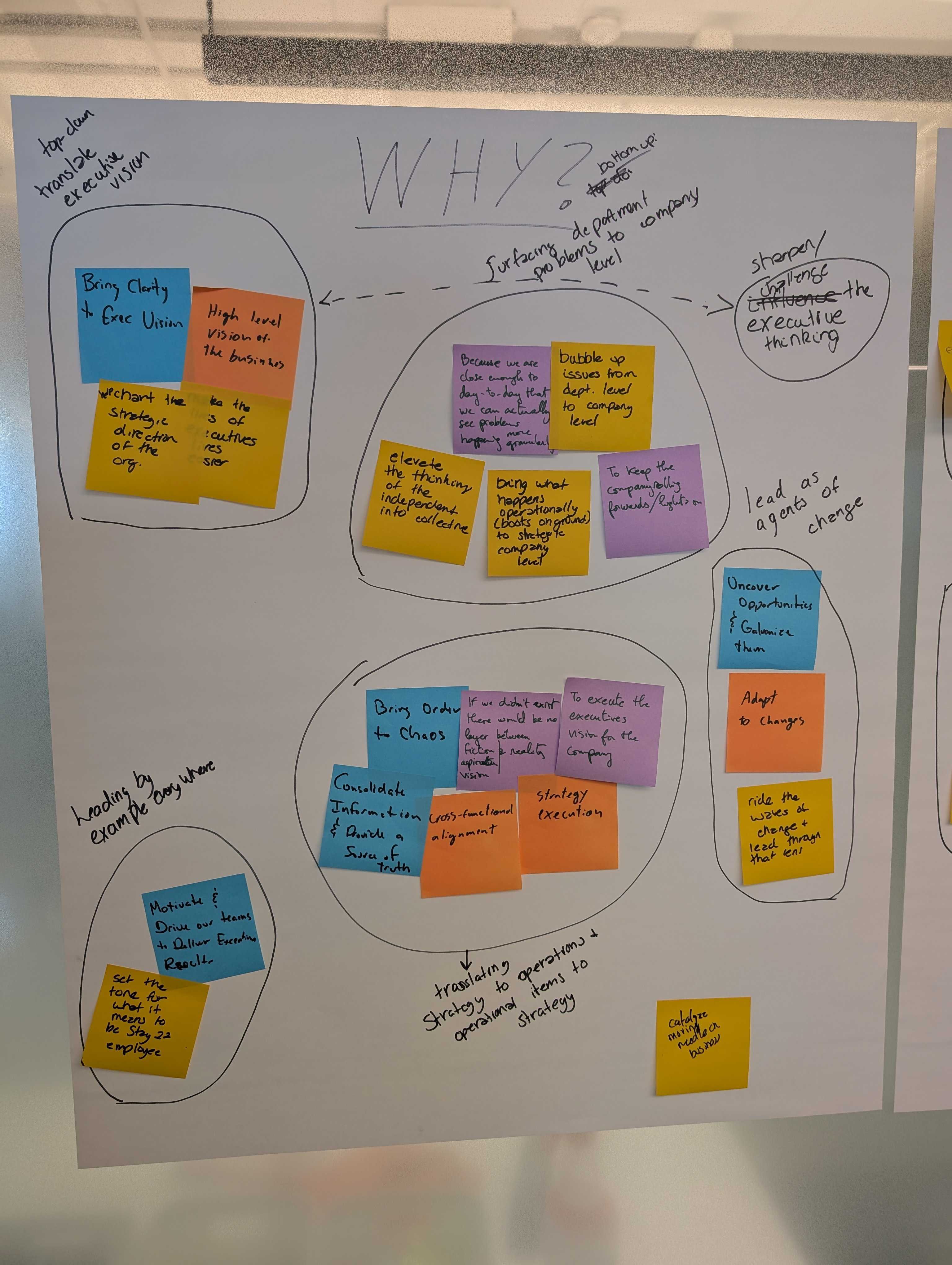 Two dominant, and seemingly contradictory, roles became clear. The first was our function as a Bridge or Funnel. Post-it notes with phrases like “Bring Clarity to Exec Vision” and “Translate strategy to operations” spoke to our role in cascading information top-down.